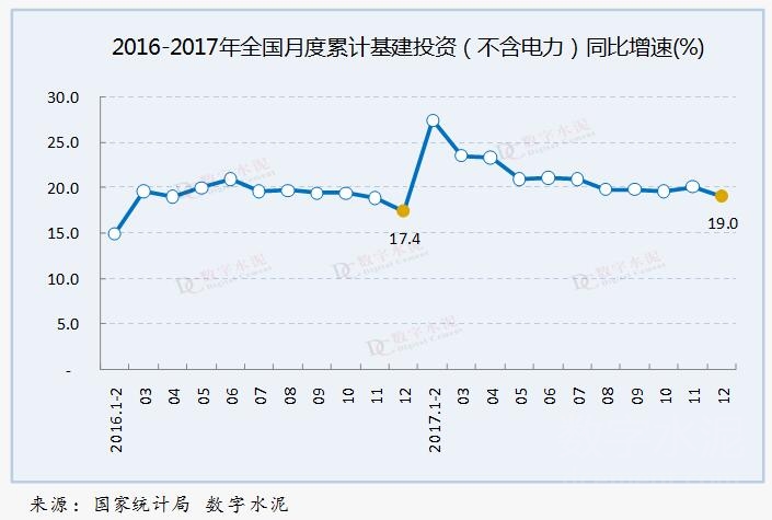 2017年,全国基础设施投资(不含电力)14万亿元,同比增长19%,增速较1-11月份下降1.1个百分点,高于去年同期1.6个百分点。其中,水利管理业投资增长16.4%,增速较1-11月份回落0.6个百分点;公共设施管理业投资增长21.8%,增速较1-11月份回落1.5个百分点;道路运输业投资增长23.1%,增速较1-11月份回落1.5个百分点;铁路运输业投资下降0.1%, 1-11月份为增长0.5%。