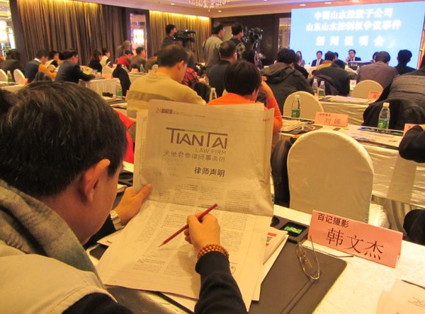 本次会议由中国山水集团主办,北京天驰君泰律师事务所、香港评报社共同协办,由中国百记公益联合会承办。来自于新闻类、法制类、金融类、财经类的全国各大媒体近百名记者,参加了今天的说明会。