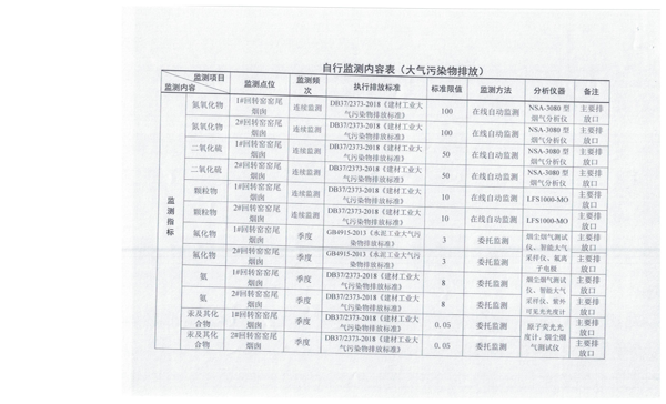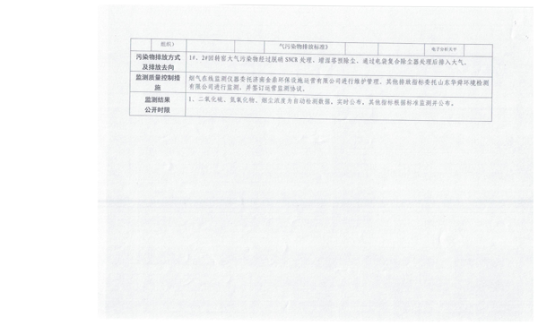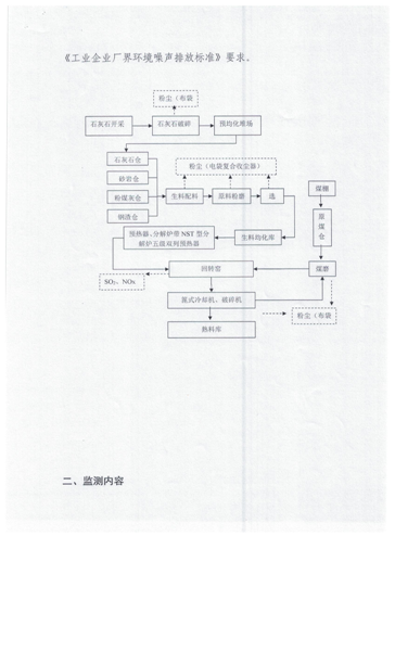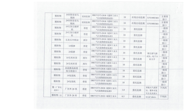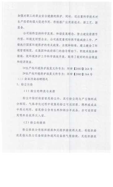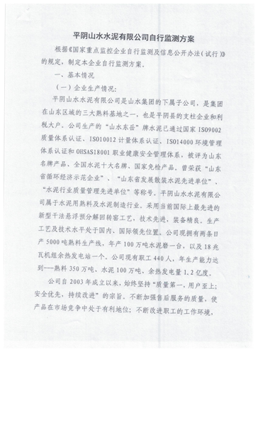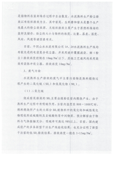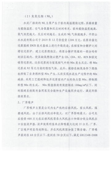 (二)平阴山水水泥有限公司生产工艺为新型干法悬浮预分解回转窑工艺,主要排放口有四个,均已安装污染源在线自动监测系统,并与国家、省、市、县联网。现执行的污染物排放标准为《建材工业大气污染物排放标准》(DB37/2373-2018),主要污染物氮氧化物、二氧化硫、颗粒物均低于标准中100mg/m³ 、50 mg/m³、10mg/m³的要求。氮氧化物经分级燃烧、SNCR选择性非催化还原脱硝系统处理,脱硝效率80%以上,.颗粒物的排放主要是经旋风筒、电袋复合收尘器处理后排入大气,收尘效率达99.99%;二氧化硫的控制主要是工艺自然吸硫。